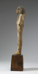 | Keywords: Egyptian - Ushabti of Si-Eset - Walters 22185 - Left Side.jpg This ushabti depicts a mummified figure with arms folded on the chest The figure has long hair painted black a hoe in the right hand and a mattock in the left There is an inscription on the front incised and filled with blue paint between 1250 1150 BC New Kingdom wood with blue and black paint cm 22 7 accession number 22 185 11376 Dikran Kelekian New York and Paris date and mode of acquisition unknown from Upper Egypt Henry Walters city Baltimore Walters Art Museum Henry Walters Acquired by Henry Walters 1914 Translation Overseer of the Marshlands Sa-saty; Inscription Extract from Chapter 6 of the Book of the Dead place of origin Mexico Walters Art Museum license Ushabti in the Walters Art Museum Ushabti of the Egyptian New Kingdom |