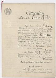 | Keywords: eiffel tower 1887 former official document agreement concluded january 8 1887 between the state represented by édouard lockroy the city of paris represented by eugene trash and gustave eiffel relating to the space and construction rules and operating tower 300 meters former name of the eiffel tower first archive page paris france 1887-1889 work |