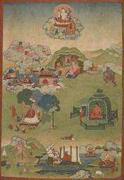| Keywords: Eight Mahasiddhas - Google Art Project.jpg This is the last painting of an eleven-painting set from Palpung monastery and dedicated to The Eighty-four Great Tantric Adepts Mahasiddhas Especially interesting is the figure of the great adept Putalipa at top center seated in a cave and gazing at an image of the meditational deity Samvara The scene offers a view of a tantric Buddhist icon in use Above in the sky are the white bodhisattva Samantabhadra and below him small red wrathful figure Cakhavartin The other figures can be identified as the bodhisattva Samantabhadra; Darikapa; Putalipa; Upanaha; Kokilipa; Anangapa; Lakshmikara; Samudra; Vyalipa Eastern Tibet 464096 Unknown /collection/rubin-museum-of-art/artwork/eight-mahasiddhas-unknown/463166/ author /collection/rubin-museum-of-art/ Rubin Museum of Art 342005 http //www rmanyc org/ 12/8/2011 11 22 02 PM /collection/rubin-museum-of-art/artwork/eight-mahasiddhas-unknown/463166/ 1701 1 18th century 1 Mineral pigments on cloth 463166 False 1800 31 18th century 12 Complete 3/24/2012 2 38 40 AM C2005 22 1 Rubin Museum of Art C2005 22 1 Painting 1700 1810 Eastern Tibet 18th century False 0 689453125 Object eight-mahasiddhas-unknown Eight Mahasiddhas e - Freer Gallery of Art and Arthur M Sackler Gallery Smithsonian Institution Washington D C Lama Patron Artist The Great Situ Panchen 03/13/10 - 07/18/10 - RMA Patron and Painter Situ Panchen and the Revival of the Encampment Style 02/06/09 - 08/17/09 Mineral pigments on cloth special url_id JgHgByAVb1Nv_Q PD-old-100 Google Art Project works by unknown artist Paintings of the Buddha Tibetan art in the Rubin Museum of Art 18th-century paintings from Tibet |
