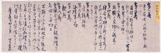 | Keywords: Eight-Point Program for a New Government WDL2939.png Artwork ru Гото Шодзи о 1838-1897 fr Gotō Shōjirō 1838-1897 en Gotō Shōjirō 1838-1897 zh 后藤 象二郎 1838-1897 pt Gotō Shōjirō 1838-1897 ar ساكاموتو ريوما 1836-1867 es Gotō Shōjirō 1838-1897 ru П ог амма из восьми пунктов для нового п авительства fr Programme en huit points pour un nouveau gouvernement en Eight-Point Program for a New Government zh 新政 八项主张计划 pt Programa de Oito Pontos para um Novo Governo ar البرنامج ثماني النقاط للحكومة الجديدة ru Этот мануск ипт является укописным п оектом п едложений сфо мули ованных Сакамото Рёма 1836-1867 гг и Гото Содзи о 1838-1898 гг п оимпе скими активистами из области Тоса ныне п ефекту а Коти на западе Японии в 1867 г В этом документе Рёма и Содзи о п едложили п ог амму политических ефо м из восьми пунктов кото ую необходимо было еализовать новому импе скому п авительству после ожидаемой отставки Токугавы Ёсинобу 1837-1913 гг последнего сёгуна П едложенные ефо мы включали п инятие новых фундаментальных законов п ивлечение способных людей на оль госуда ственных советников установление дипломатических отношений с за убежными ст анами и уч еждение па ламента и штаб-ква ти ы а мии и флота <br>Политика и уп авление fr Ce manuscrit est l'ébauche écrite à la main de propositions formulées par Sakamoto Ryōma 1836-67 et Gotō Shōjirō 1838-97 activistes pro-impériaux du Domaine de Tosa aujourd'hui préfecture de Kochi à l'ouest du Japon en 1867 Dans ce document Ryōma et Shōjirō proposèrent un programme en huit points de réformes politiques à mettre en œuvre par le nouveau gouvernement impérial après l'abdication prévue de Tokugawa Yoshinobu 1837-1913 le dernier shogun Ces réformes proposées comportaient la promulgation de nouvelles lois fondamentales le recrutement de personnes compétentes pour servir de conseillers gouvernementaux l'établissement de relations diplomatiques avec les puissances étrangères et la création d'un parlement et d'un état-major pour l'armée et la marine <br>Politique et gouvernement en This manuscript is the handwritten draft of proposals formulated by Sakamoto Ryōma 1836-67 and Gotō Shōjirō 1838-97 pro-imperial activists from the Tosa Domain now Kochi prefecture in western Japan in 1867 In this document Ryōma and Shōjirō proposed an eight-point program of political reforms to be undertaken by the new imperial government after the expected resignation of Tokugawa Yoshinobu 1837-1913 the last shogun The proposed reforms included enactment of new fundamental laws recruitment of capable people to serve as government advisers establishment of diplomatic relations with foreign powers and establishment of a parliament and of a headquarters for the army and the navy <br>Politics and government zh 这份手稿是 龙马(1836-67 年)和后藤象二郎(1836-97 年)1867 年提案的手写草稿,两人都是日 西部的 佐藩(今高知县)出身 该文件中, 龙马与后藤象二郎提出了八 政治改 计划 船中八策 ,以供新 国政 日 后 位将军德 庆 (1837-1913 年) 位后采用 这些改 建议包括制定新的基 法律 重用 才能的人担任政 顾问 与外国中的强国建立外交关系并成立议会和陆海军 部 <br>政治与政 pt Este manuscrito é o esboço feito à mão de propostas formuladas por Sakamoto Ryōma 1836-67 e Goto Shojiro 1838-97 ativistas proimperialistas do Domínio de Tosa hoje prefeitura de Kochi no oeste do Japão em 1867 Neste documento Ryōma e Shojiro propuseram um programa de oito tópicos de reformas políticas a serem implementadas pelo novo governo imperial após a esperada renúncia de Tokugawa Yoshinobu 1837-1913 o último shogun As reformas propostas incluíam a promulgação de novas leis fundamentais o recrutamento de pessoas capazes de servir como consultores governamentais o estabelecimento de relações diplomáticas com potências estrangeiras e a criação de um parlamento e de uma sede para o exército e a marinha <br>Política e governo ar هذه المخطوطة مسودة مكتوبة باليد للمقترحات التي صاغها ساكاموتو ريوما 1836-67 وغوتو شوجيرو 1838-97 ، من النشطاء الموالين للإمبراطورية، من إقليم توسا مقاطعة كوشي حاليا في غرب اليابان، عام 1867 في هذه الوثيقة، طرح ريوما وشوجيرو برنامجا للإصلاح السياسي من ثمان نقاط للضطلاع بها من قبل الحكومة الإمبراطورية الجديدة بعد الاستقالة المتوقعة لتوكوغاوا يوشينوبو 1837-1913 ، الشوغان الأخير وشملت الإصلاحات المقترحة سن قوانين أساسية جديدة، وتوظيف الناس المقتدرين للعمل كمستشارين حكوميين، وإقامة علاقات دبلوماسية مع الدول الأجنبية، وإنشاء برلمان ومقر قيادة للجيش والقوات البحرية <br>السياسة والحكومة es Este manuscrito es el proyecto a mano de las propuestas formuladas por Sakamoto Ryōma 1836-1867 y Gotō Shōjirō 1838-1897 activistas proimperiales del dominio Tosa actualmente la prefectura de Kochi en el oeste 