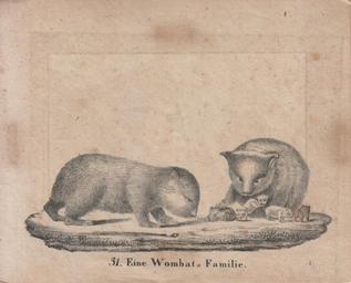 | Keywords: Eine Wombat-Familie, 1809.jpg 31 Eine Wombat-Familie <br /> Tafel 31 in Neue Bildergallerie für die Jugend Band 1 VI Heft Gotha bei Carl Hellfarth 1828 <br /> http //zs thulb uni-jena de/rsc/viewer/jportal_derivate_00227988/Neue_Bildergalerie_f_d_Jugend_216860679_1928_0095 TIF<br /> Beschreibung http //zs thulb uni-jena de/rsc/viewer/jportal_derivate_00227988/Neue_Bildergalerie_f_d_Jugend_216860679_1928_0010 TIF Collection Kuhn 1828 author PD-old Vombatus ursinus Neue Bildergallerie für die Jugend Furrier's collection Kuhn |