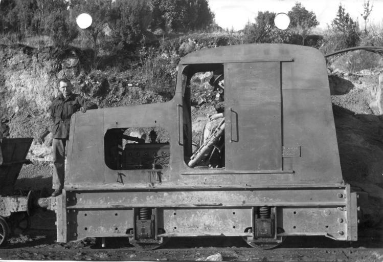 Keywords: train railway tasmania blackandwhite monochrome outdoor black and white The International powered locomotive built by Allport's in Hobart for the Mount Bischoff mine at Warattah. Ted Lidster collection The International powered locomotive built by Allport's in Hobart for the Mount Bischoff mine at Warattah. Ted Lidster collection