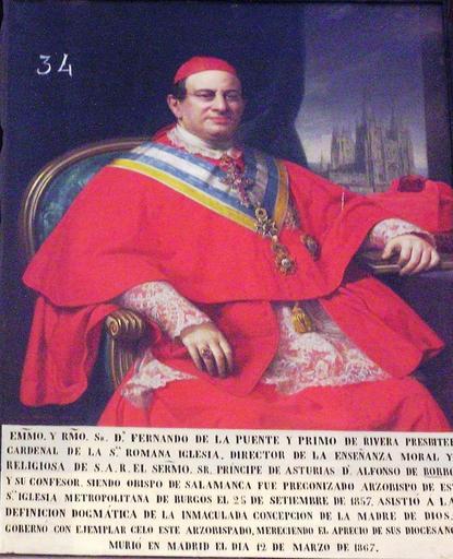 | Keywords: El cardenal Fernando de la Puente y Primo de Rivera (1808-1867), arzobispo de Burgos.jpg Retrato del cardenal Fernando de la Puente y Primo de Rivera 1808-1867 que fue arzobispo de Burgos y obispo de Salamanca Siglo XIX oil canvas Size cm Institution Cathedral of Burgos https //burgospedia1 wordpress com/2013/05/25/fernando-de-la-puente-y-primo-de-rivera-cardenal-y-eclesiastico/ object history exhibition history credit line accession number https //burgospedia1 wordpress com/2013/05/25/fernando-de-la-puente-y-primo-de-rivera-cardenal-y-eclesiastico/ PD-old-100 Fernando de la Puente y Primo de Rivera Paintings in the Cathedral of Burgos Uploaded with UploadWizard |