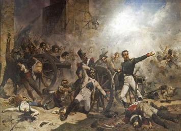 | Keywords: El Dos de Maig. Defensa del Parque de Artilleria de Monteleón, en Madrid, el día Dos de Mayo de 1808..JPG Artwork Creator Joaquín Sorolla El Dos de Maig Defensa del Parque de Artilleria de Monteleón en Madrid el día Dos de Mayo de 1808 Pedro Velarde y Santillán during the defence of the Monteleon Artillery Barracks ca Escena de la defensa del Parque de Artillería durant l'aixecament de la ciutat de Madrid el 2 de maig de 1808 contra l'exèrcit napoleònic Centra la composició l'artiller Pedro Velarde en el moment d'ésser abatut A la seva esquerra hi ha Luis Daoíz ordenant noves posicions dolorosament ferit arrepenjant-se al canó La resta de la tela presenta un gran grup de personatges anònims que arroseguen canons disparen amb fusells i ataquen amb ganivets i pals envoltats per un terra ple de víctimes L'ambient és ple de fum de trets 1884 Oil on canvas cm Institution Biblioteca Museu Víctor Balaguer object history exhibition history credit line accession number place of creation Biblioteca Museu Víctor Balaguer-cooperation 100px PD-Art PD-old-auto-1923 1923 Uploaded with UploadWizard Paintings in the Biblioteca Museu Víctor Balaguer Dos de Mayo Uprising Dipòsit Museo del Prado a la BMVB Paintings of battles by Joaquín Sorolla Monteleón Barracks Madrid Luis Daoiz de Torres |