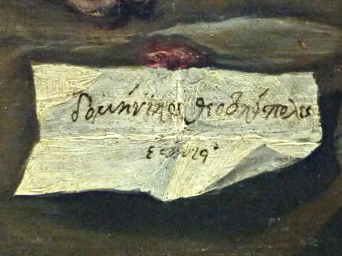 | Keywords: El Greco - St Andrew and St Francis (signature detail).jpg Artwork Q5841454 Creator El Greco Detalle de la obra representa al apóstol San Andrés que era hermano del apóstol San Pedro junto a San Francisco de Asís fundador de la Orden de los franciscanos Detail from the lower right corner of St Andrew and St Francis showing El Greco's signature Museo del Prado Madrid Λε τομέρεια α ό το κάτω δεξιό μέρος του ίνακα Ο Αγ Ανδρέας και ο Αγ Φραγκίσκος στην ο οία φαίνεται η υ ογραφή του ζωγράφου ουσείο Πράδο αδρίτη ~ 1595 Oil on canvas size cm 167 113 Institution Museo del Prado Sala 009B https //www museodelprado es/coleccion/obra-de-arte/san-andres-y-san-francisco/4c244b9b-076f-4468-9ddc-4dd63dbf72dd object history credit line accession number P02819 own PD-old-100 cc-by-sa-4 0 St Andrew and St Francis El Greco Details of paintings by El Greco |