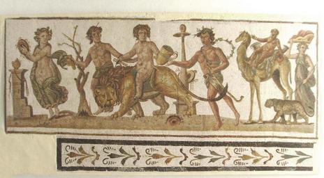 Keywords: El Jem Museum (10).JPG en Bacchus and his cortege A mosaic in the archaelogical museum of El Jem Own Effi Schweizer 2009-03-18 Dionysiac mosaics in the El Jem museum Procession Frame drums Mosaics of dromedaries Mosaics of lions