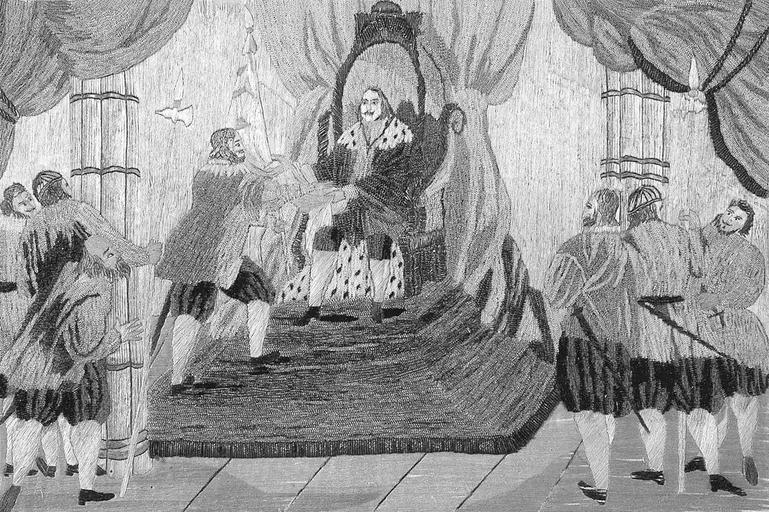 View Original:El Rei D. Manoel commette a Vasco da Gama a empreza do descobrimento da India, e lhe entrega a bandeira - 18th-century embroidery.png (1148x764)
