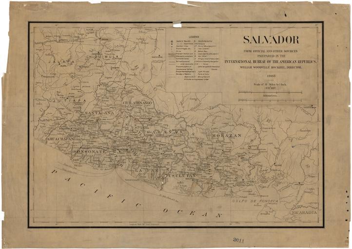 | Keywords: El Salvador - from Official and Other Sources WDL11324.png Artwork ru Сальвадо из официальных и иных источников fr Le Salvador à partir de sources officielles et autres en El Salvador - from Official and Other Sources zh 萨尔瓦多 - 自官方和其它 源 pt El Salvador - de fontes oficiais e outras fontes ar السلفادور - من مصادر رسمية وغير ذلك ru Эта ка та Сальвадо а 1903 года была опубликована еждуна одным бю о аме иканских еспублик п еоб азовано в 1910 году в Панаме иканский союз ведомством уч ежденным в 1890 году в Вашингтоне ок уг Колумбия по аспо яжением еждуна одного союза аме иканских еспублик Бю о занималось выпуском уководств ка т и ежемесячного бюллетеня для асп ост анения инфо мации о п одвижении то говли между ст анами Севе ной и Южной Аме ики а ка те изоб ажена столица ст аны Сан-Сальвадо ; столицы депа таментов и д угие важные го ода; г аницы между госуда ствами и п овинциями; подводные кабели телег афные станции автомобильные и железные до оги действующие ст оящиеся и плани уемые а также экономически важные объекты а именно маяки и по ты ввоза това ов; физические объекты в том числе еки озе а вулканы и го ы Сальвадо г аничащий на западе с Гватемалой на севе е с Гонду асом и омываемый водами Тихого океана на юге является единственной ст аной в Цент альной Аме ике без п ямого выхода к Ка ибскому мо ю и Атлантическому океану Ка та х анится в емо иальной библиотеке имени Колумба О ганизации Аме иканских Госуда ств кото ая является п авоп еемницей о ганизации еждуна одного союза аме иканских еспублик и Панаме иканского союза fr Cette carte du Salvador de 1903 fut publiée par le Bureau international des Républiques américaines qui devint l'Union panaméricaine en 1910 organisme créé en 1890 à Washington district de Columbia par résolution de la Conférence internationale des États américains Le bureau publiait des manuels des cartes et un bulletin mensuel pour diffuser des informations relatives à la promotion du commerce entre les pays des Amériques La carte montre la capitale San Salvador les capitales des départements et d'autres villes importantes les frontières internationales et départementales les câbles sous-marins les stations de télégraphe les routes et les chemins de fer opérationnels en construction et proposés Elle inclut également d'autres sites économiques importants tels que les phares et les ports d'entrée ainsi que les caractéristiques physiques notamment les rivières les lacs les volcans et les montagnes Bordé par le Guatemala à l'ouest le Honduras au nord et l'océan Pacifique au sud le Salvador est le seul pays d'Amérique centrale sans accès direct à la mer des Caraïbes et à l'océan Atlantique La carte est conservée à la Bibliothèque Colomb de l'Organisation des États Américains organisation qui succéda au Bureau international des Républiques américaines et à l'Union panaméricaine en This 1903 map of El Salvador was published by the International Bureau of the American Republics instituted in 1910 as the Pan American Union an agency established in 1890 in Washington D C by resolution of the International Conference of American States The bureau issued handbooks maps and a monthly bulletin for disseminating information relating to the promotion of trade among the countries of the Americas The map shows the capital city of San Salvador; the capitals of departments and other important cities; international and departmental borders; submarine cables telegraph stations roads and railroads operational under construction and proposed Also included are other sites of economic importance such as lighthouses and ports of entry; and physical features including rivers lakes volcanoes and mountains Bordered by Guatemala to west Honduras to the north and the Pacific Ocean to the south El Salvador is the only country in Central America with no direct access to the Caribbean Sea and the Atlantic Ocean The map is held in the Columbus Memorial Library of the Organization of American States successor organization of the International Bureau of the American Republics and the Pan American Union zh 这张 1903 年的萨尔瓦多 图由美洲共和国国际 (1910 年改称为泛美联盟)出版,该 构于 1890 年 华盛顿特区根据美洲国家国际会议的决议 成立 该 出版了大量手册 图以及 份每 公报,旨 过传播信息促进美洲各国之间的贸易 该 图标示出了首都 萨尔瓦多 各 会及其它重要城市 国界和 界 海底电缆 电报站 公路以及(当时运营中 建设中和规划中的)铁路 图上还标示了其它重要经济设施,如灯塔和入境口岸以及各种 理特征,包括河流 湖泊 火山和山脉 萨尔瓦多西接危 马拉,北邻洪都拉斯,南临太平洋,是中美洲唯 没 与加勒比海和大西洋相连的国家 该 图现 存 美洲国家组织(前身为美洲共和国国际 和泛美联盟)的哥伦布纪念图书馆 pt Este ma