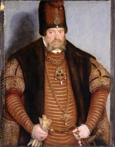 | Keywords: Elector Joachim II of Brandenburg (DE SPSG GKI1113).jpg watermark Artwork Creator Lucas Cranach d J de die Pelzmütze ist mit einem Christusmongramm his verziert in der linken Hand hält er einen Rosenkranz en The painting depicts Elector Joachim II of Brandenburg as an almost life-size half-length figure against a light background The sable hat is decorated with the monogram of Christ his Joachim wears two chains with pendants around his neck holds a rosary in his left hand and has a ring on his finger ca 1570 oil lime panel cm 112 2 88 institution Jagdschloss Grunewald Hans-Joachim Giersberg Preußens Glanz Königsschlösser in Berlin und Brandenburg Munich 2007 p 8 object history de 1699 vermutlich im Potsdamer Stadtschloss; - 1793 nachweislich im Berliner Schloss Potsdam City Palace in 1699 - evidently in the Berlin Palace in 1793 credit line de 1563 verkündete Joachim II sein lutherisches Glaubensbekenntnis hier ist er nicht als protestantischer Fürst dargestellt 1569 erfolgte nach Verhandlungen mit dem polnischen König die Mitbelehnung mit dem Herzogtum Preußen In dem hohen und ungewöhnlichen Pelzhut sieht Forschung ein polnisches Kleidungsstück mit dem Joachim II möglicherweise die enge Verbindung zu seinem Schwager dem polnischen König Sigismund II August betonen wollte Sigismund II Augustus Joachim was co-enfoeffed with the Duchy of Prussia The striking fur hat worn by Joachim has been interpreted by some researchers as a Polish item of apparel possibly intended to manifest his close connection with the Polish throne accession number DE SPSG GKI1113 http //lucascranach org/DE_SPSG_GKI1113 Cranach Digital Archive <gallery>Image Joachim II Brandenburg png</gallery> PD-old-100-1923 DEFAULTSORT Cranach Lucas 2; Joachim II of Brandenburg; Jagdschloss Grunewald Portrait paintings by Lucas Cranach the Younger Paintings by Lucas Cranach the Younger with fur Joachim II of Brandenburg Fur fashion in 1570 IHS in Germany Paintings in Jagdschloss Grunewald Portrait paintings with blue background Sable clothing in art Sable headgear in art 1570s paintings in Berlin 1570s portrait paintings Images uploaded by Fæ |