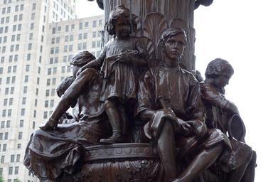 | Keywords: Electroliers, New York State Education Department Building - DSC08327.JPG Two electroliers or street lamps flank the entrance to a building They have the same design except the one depicts children studying; the other children relaxing after play Both electroliers are topped by a 20 inch-high hexagonal lamp encircled by smaller dome-shaped lights Below each light is an owl holding a garland of flowers in its beak The children appear at the base of the shaft with lion's heads below them On the right lamp nine children are seen studying dressed in school clothes They are seen reading writing counting examining a globe and holding a violin On the left lamp the children holding various toys including a doll a football a hoop a small boat a teddy bear a baseball bat and glove a tennis racket and ball and roller skates Both lamps have a brown patina This artwork is in the public domain because first published in the United States before 1923 2013-06-13 12 30 26 own Daderot cc-zero Electroliers New York State Education Department Building Uploaded with UploadWizard |