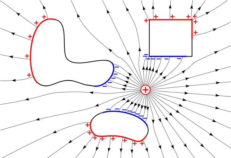 Keywords: Electrostatic induction.svg Diagram of electric charges induced in conductive objects shapes by the electrostatic field lines with arrows of a nearby charge + due to electrostatic induction An electric charge near a metal object causes the mobile charges in the metal to separate If the external charge is positive as shown negative charges <font color blue > blue </font> are attracted and move to the surface of the object facing the external charge positive charges <font color red > red </font> are repelled and move to the surface of the object facing away This charge separation quickly reaches an equilibrium and stops when the induced surface charges are exactly the right size and shape so their opposing electric field cancels the external electric field throughout the interior of the metal Therefore electrostatic field lines cannot penetrate conductive objects; they always end on induced charges on the surface and the interior of a conductive object is at a constant electrostatic potential The drawing also illustrates that electric field lines at a metal surface are always normal perpendicular to the surface except at sharp corners and induced charge tends to collect at sharp edges and points<br> This is a freehand drawing and the distribution of the electostatic field lines and charges shown is not quantitatively accurate as are field diagrams drawn by computer programs own 2010-10-11 Chetvorno I Chris Burks Chetvorno the author of this work release it into the public domain for any use whatever Field lines around conducting surfaces Electrostatics Electric fields around charges |
