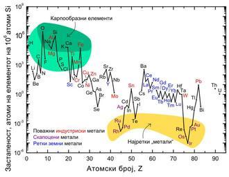 | Keywords: Elemental abundances mk.svg елементите во Земјината ко а е се п икажани благо одните гасови Tc 43 Pm 61 и сите елементи по Bi 83 освен Th 90 и U 92 en Diagram in Macedonian of the relative abundance of elements in the Earth's upper crust Not shown Noble Gases Tc 43 Pm 61 and all elements after Bi 83 except for Th 90 U 92 File Elemental abundances svg B Jankuloski original by Michbich 2012-10-21 <gallery> File Elemental abundances svg language en File Elemental abundances-RUS svg language ru </gallery> Cc-zero Elements abundance Diagrams in Macedonian |