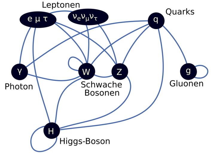 | Keywords: Elementary particle interactions-de.svg Version with german text cleaned up source code A diagram summarizing the tree-level interactions between elementary particles described in the Standard Model Vertices darkened circles represent types of particles and edges blue arcs connecting them represent interactions that can take place The organization of the diagram is as follows the top row of vertices leptons and quarks are the matter particles; the second row of vertices photon W/Z gluons are the force mediating particles; and the bottom row is the Higgs boson en Image Elementary particle interactions svg 2007-01-14 2008-02-03 2016-06-28 en User TriTertButoxy User Stannered User Doktorchen <gallery> File Elementary particle interactions svg English version </gallery> Standardmodell |