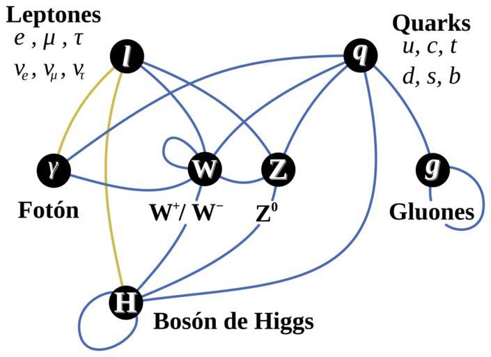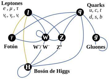 | Keywords: Elementary-particle-interactions-es.svg modelo estándar Cada círculo oscuro es un tipo de partícula Una línea conecta dos círculos cuando las partículas correspondientes pueden interaccionar En la primera fila están los fermiones o partículas de materia del modelo estándar leptones y quarks En la segunda los bosones vectoriales o partículas mediadoras asociadas con cada interacción del modelo estándar fotón bosones W y Z gluones En la última fila se encuentra el bosón de Higgs Las líneas que unen los leptones con el fotón y el Higgs son de color distinto al resto El fotón no interacciona con los neutrinos sólo con los leptones cargados En el modelo estándar estricto el Higgs no interacciona tampoco con los neutrinos aunque esto es aún objeto de investigación Elementary_particle_interactions svg 50 2012-07-05 11 46 UTC Elementary_particle_interactions svg en User TriTertButoxy User Stannered derivative work Kismalac inkscape spanish version small change kismalac Elementary_particle_interactions svg PD-user-en PD-user-w Original upload log This image is a derivative work of the following images File Elementary_particle_interactions svg licensed with PD-user-en PD-user-w 2008-02-24T15 59 55Z Stannered 775x555 35614 Bytes <nowiki>adding W self-interaction</nowiki> 2008-02-03T17 52 30Z Stannered 775x555 37690 Bytes <nowiki>MediaWiki has no unicode TNR equivalent when will they install FreeSerif </nowiki> 2008-02-03T17 51 31Z Stannered 775x555 22110 Bytes <nowiki> A diagram summarizing the tree-level interactions between elementary particles described in the Standard Model Vertices darkened circles represent types of particles and edges blue arcs connec</nowiki> Uploaded with derivativeFX Higgs boson Standard Model physics |