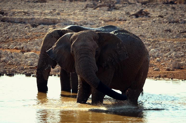 Keywords: elephant group family proboscis wild animals africa mammals sky nature drought pachyderm animals tusk safari water hole swim drink summer national park namibia etosha wilderness majestic large pride rest savannah landscape