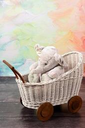 Keywords: elephant toy plush fun studio the mascot stroller wicker white gray brown colorful joy sitting