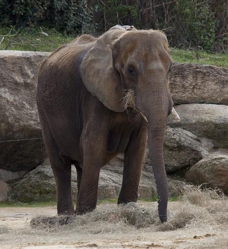 Keywords: elephant zoo wildlife nature animal trunk big large eating hay vegetation mammal