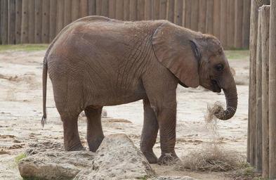 Keywords: elephant zoo young wildlife nature animal trunk big large eating hay vegetation mammal baby