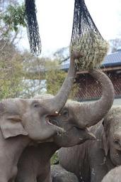 Keywords: elephants feeding hay straw zoo animal elephant mammal big large trunk wild africa park feed nose nature tusk heard grey smiling happy ears two elephants teeth herbivore powerful