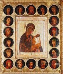 | Keywords: Eleusa with Old Testament women (Annunciation cathedral in Moscow).jpg Шуйская-Смоленская икона Божией ате и XV в в аме с об азами п амате ей и п о очиц кон XVII нач XVII в из местного яда в клеймах кото ой изоб ажены восемнадцать ветхозаветных п аведниц1 Авигея д -ев Abigajil ой отец ликует вто ая жена ца я Давида; Ависага см Сунамитянка ; Анна д -ев Ḥanna илостивая мать п о ока Самуила см также С етение; Товия ; Дево а; Ева; Иудифь см Юдифь ; Иаиль д -ев Ja el Се на дикая коза см Убийство Сиса ы ; Лия д -ев Le a Слабая см Жизнь деятельная и созе цательная ; а иам д -ев Mirjam Высокая сест а оисея и Аа она; Ревекка д -ев Ribka Узы оковы к асоты жена Исаака мать Иакова см п аотцы ; Рахиль д -ев Raḥel Овечка вто ая жена Иакова см Жизнь деятельная и созе цательная ; Раав д -ев Rahab Ши окая обши ная блудница из Ие ихона помогавшая Иисусу авину п и взятии го ода см Ие ихона стены ; Руфь; Са ептская вдова; Сунамитянка; Сусанна; Са а; Эсфи ь д -ев Ester Звезда см А таксе кс Аман и Эсфи ь Клейма иконы Богомате и писали иконописцы О ужейной палаты в оскве в новой мане е см ст огановская школа; ф яжский стиль и они значительно отличаются от с едника П аведницы изоб ажены в к углых медальонах в каждом помещена надпись имя и ф аза как бы исходящая из уст однако часть надписей с п авой сто оны амы сделана так что п очесть их можно только с помощью зе кала Заказ на столь необычное п оизведение ве оятно поступил от ца ицы атальи Алексеевны сест ы ца я Пет а I в 1698 г В этот год ца ь Пет с очно ве нулся из заг аничного путешествия в оскву для подавления ст елецкого бунта см Ут о ст елецкой казни Зачинщицу бунта ца евну Софью пост игли в монахини и заточили в оводевичий монасты ь Существует ве сия что иконописец в облике п аведницы Сусанны ее по т ет находится в цент е нижнего к ая амы пе едал че ты опальной ца евны Софьи п инявшей в пост иге имя Сусанна хотя во всех по т етах угадываются че ты Софьи Если эта гипотеза ве на тогда изоб ажение почитаемых и п аведных жен можно ассмат ивать в качестве знака покаяния и п ими ения исходившего от сводной сест ы бунтовщицы Изоб ажения п аведниц составляют симмет ичные па ы по смыслу их жития надписи с помощью зе кала слагаются в символический текст и таким об азом ама с клеймами становится символическим зе калом от ажающим чистоту Девы а ии А поскольку сама Богомате ь в духовной лите ату е уподобляется чистому зе калу без пятна см Зе цало Богомате и все п оизведение об етает ск ытый смысл обусловленный п ост анственной метафо ой зе кала в зе кале http //www pravenc ru/text/149295 html 15-17 c anonymous PD-old-100 Eleusa with Old Testament women Annunciation cathedral in Moscow Files uploaded by Shakko from various sources |