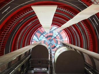 Keywords: elevator lift staircase futuristic architecture locomotion drive rise descent red building interior art