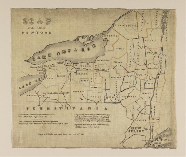| Keywords: Elizabeth Ann Goldin, American - Map of the State of New York - Google Art Project.jpg 1814 1896 American 5492583 Elizabeth Ann Goldin 1814 - 1896 /collection/cooper-hewitt-national-design-museum/artwork/map-of-the-state-of-new-york-elizabeth-ann-goldin-american/6712567/ 75188 Elizabeth Ann Goldin American /artist/elizabeth-ann-goldin/6833128/ 6833128 /collection/cooper-hewitt-national-design-museum/ Cooper-Hewitt National Design Museum 3644669 http //www cooperhewitt org/ /collection/cooper-hewitt-national-design-museum/artwork/map-of-the-state-of-new-york-elizabeth-ann-goldin-american/6712567/ 1829 1829 Medium silk embroidery wool foundation pencilTechnique embroidered in cross stem chain back and four-sided stitches on plain weave foundation By 1941 Mrs Henry E Coe Eva Johnston Coe 1941 Museum for the Arts of Decoration of the Cooper Union 515 6712567 False 1829 1941-69-124 http //collection cooperhewitt org/view/objects/asitem/id/75188 Bequest of Mrs Henry E Coe Map sampler 1820 1830 w590 x h515 cm 1829 False 1 1824480369515 Object map-of-the-state-of-new-york-elizabeth-ann-goldin-american Map of the State of New York m 590 Hilda Kassell Stitches in Time The Art and History of Embroidery New York Duell Sloan and Pearce 1966 41 Ethel Stanwood Bolton and Eva Johnston Coe American Samplers Boston The Massachusetts Society of the Colonial Dames of America 1921 163 H x W 51 5 x 59 cm 20 1/4 x 23 1/4 in Worked by Elizabeth Ann Goldin New York May 21st 1829 Medium silk embroidery wool foundation pencilTechnique embroidered in cross stem chain back and four-sided stitches on plain weave foundation By 1941 Mrs Henry E Coe Eva Johnston Coe 1941 Museum for the Arts of Decoration of the Cooper Union special url_id cQGgA2A6dYLM4Q PD-old-100-1923 1896 Google Art Project works by Elizabeth Ann Goldin Textiles in the Cooper “Hewitt Smithsonian Design Museum 1820s samplers Google Art Project works in Cooper-Hewitt Smithsonian Design Museum Silk map Maps of New York 1829 works |