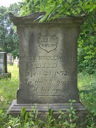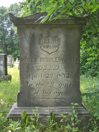 | Keywords: Elizabeth Middleswarth Monument, Bethany Cemetery, 2015-06-11, 01.jpg en Grave marker in the Bethany Cemetery South Fayette Township Allegheny County Pennsylvania 2015-06-11 09 46 48 own Cbaile19 other versions According to http //bethanypresby org/about-us/our-history/ church records Moses Middleswarth was one of the original owners of the land purchased for the cemetery in 1814 cc-zero Bethany Cemetery South Fayette Township Allegheny County Pennsylvania Uploaded with UploadWizard | ||||
