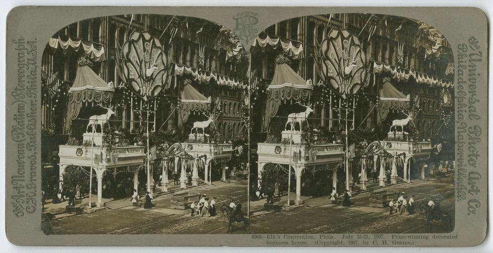 Keywords: stereographs philadelphia decorations competitions businesses strawbridge & clothier strawbridgeclothier elks' convention elksconvention View of Strawbridge & Clothier, decorated for the Elks' Convention, held July 15-21, 1907 in Philadelphia. Strings of lights, flower garlands, potted plants, bunting, elk statues and American flags adorn the building. A massive sign announces "welcome BPOE." Pedestrians travel on the sidewalk and street adjacent to the building. Accession number: P.2011.47.1545 View of Strawbridge & Clothier, decorated for the Elks' Convention, held July 15-21, 1907 in Philadelphia. Strings of lights, flower garlands, potted plants, bunting, elk statues and American flags adorn the building. A massive sign announces "welcome BPOE." Pedestrians travel on the sidewalk and street adjacent to the building. Accession number: P.2011.47.1545 |