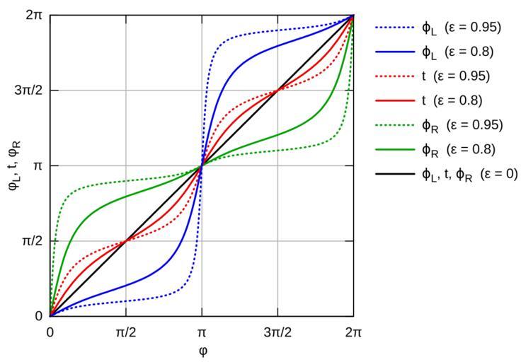 Keywords: Ellipse Angles Relation.svg en Different angles of an ellipse as a function of the polar angle φ for eccentricity ε 0 95 ε 0 8 and ε 0 eccentric anomaly t true anomaly ϕ_R with right focus as reference and true anomaly ϕ_L with left focus as reference point own Franzl aus tirol 2012-08-24 Created with Gnuplot Ellipses Eccentricity Cc-zero |