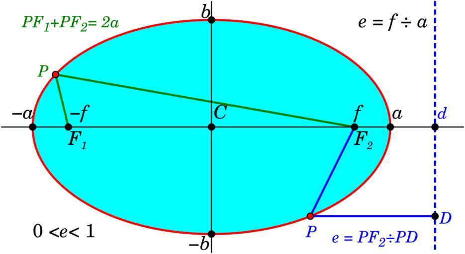| Keywords: Ellipse Properties of Directrix and String Construction.svg ellipse including<br> The distance to a focus F from the centre C is the eccentricity e multiplied by the semimajor axis a The distance from one focus to the other via any point on the ellipse P is always 2a The distance from a point P on the ellipse to a focus is always proportional to the distance to a vertical line D called the directrix The constant of proportionality is the eccentricity e The eccentricity is always between 0 and 1 At zero the ellispe becomes a circle at 1 the ellipse becomes a parabola Greater than one it is a hyperbola <br> Ellipse properties> e 0 8 a 170 px b 102 px f e a 136 px d a/e 212 5 px Origin 0 px 0 px <br> Other related images <br> 150px 150px <br> These images were edited with the free open source program Inkscape Ellipse_Properties svg 2010-07-03 18 32 UTC Ellipse_Properties svg Inductiveload derivative work Dave3457 <span class signature-talk >talk</span> derivative work ElectroKid <small> </small> Inkscape 41735 2421 U Krishnavedala Simplied and foci where in the wrong place dave3457 Ellipse_Properties svg cc-zero cc-pd Ellipses |