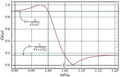| Keywords: Elliptic Filter Response (4th Order, Detail).svg elliptic filter detail of the transistion band Also shown is the maximum extent of the passband ripples where is the ripple factor and L<sub>n</sub> is the discrimination factor own Inductiveload 2009-01-29 Mathematica Code <pre><nowiki> xp2zeta_ Module g num den g Sqrt4 zeta 2 + 4 zeta 2 zeta 2 - 1 2/3 ; num 2 zeta 2 Sqrtg; den Sqrt8 zeta 2 zeta 2 + 1 + 12 g zeta 2 - g 3 - Sqrtg 3; num/den ; xz2zeta_ zeta 2/xp2zeta; tzeta_ Sqrt1 - 1/zeta 2; r1zeta_ x_ x; r2zeta_ x_ tzeta + 1 x 2 - 1 / tzeta - 1 x 2 + 1 ; r3zeta_ x_ x 1 - xp2zeta x 2 - xz2zeta / 1 - xz2zeta x 2 - xp2zeta ; r4zeta_ x_ Module num den num 1 + tzeta 1 + Sqrttzeta 2 x 4 - 2 1 + tzeta 1 + Sqrttzeta x 2 + 1; den 1 + tzeta 1 - Sqrttzeta 2 x 4 - 2 1 + tzeta 1 - Sqrttzeta x 2 + 1; num/den ; ellgainxi_ w_ w0_ ep_ 1/Sqrt1 + ep 2 r4xi w/w0 2; Plot ellgain1 05 w 1 0 5 w 0 3 </nowiki></pre> Elliptic filters |