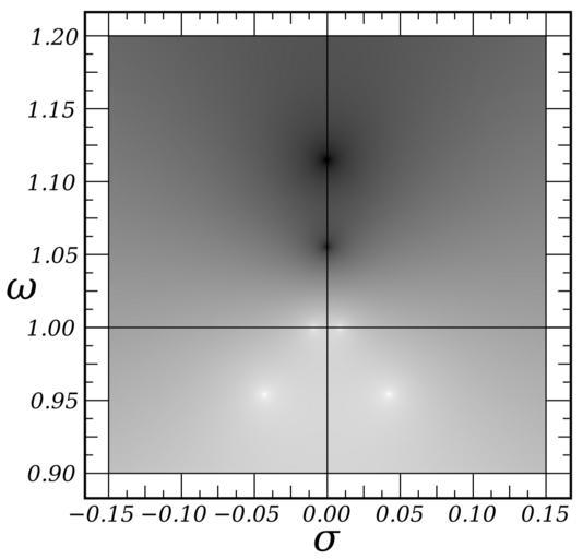 Keywords: Elliptic Filter s-Plane Response (8th Order, Detail).svg elliptic filter Values less than 0 0001 are black; greater than 10 are in white 1 05 0 5 and <sub>0</sub> 1 own Inductiveload date Mathematica Code <pre><nowiki> xp2xi_ Module g num den g Sqrt4 xi 2 + 4 xi 2 xi 2 - 1 2/3 ; num 2 xi 2 Sqrtg; den Sqrt8 xi 2 xi 2 + 1 + 12 g xi 2 - g 3 - Sqrtg 3; num/den; xz2xi_ xi 2/xp2xi; txi_ Sqrt1 - 1/xi 2; Use particular values for low-order functions r1xi_ x_ x; r2xi_ x_ txi + 1 x 2 - 1 / txi - 1 x 2 + 1 ; r3xi_ x_ x 1 - xp2xi x 2 - xz2xi / 1 - xz2xi x 2 - xp2xi ; Use nesting property for higher-degree functions r4xi_ x_ r2r2xi xi r2xi x; r8xi_ x_ r4r2xi xi r2xi x; ellgainxi_ w_ w0_ ep_ 1/Sqrt1 + ep 2 r8xi w/w0 2; DensityPlot w0 1; ep 0 5; xi 1 05; min 0 0001; max 10; LogAbs ellgainxi sig + I w w0 I ep sig -0 15 0 15 w 0 9 1 2 PlotRange -> Logmin Logmax PlotPoints -> 100 ColorFunction -> GrayLevel ClippingStyle -> Black White Frame -> False ImageSize -> 2000 </nowiki></pre> Elliptic filters Pole-zero plots |