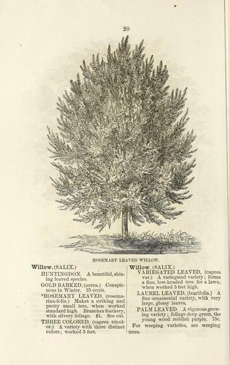 | Keywords: Ellwanger and Barry's descriptive catalogue of ornamental trees and shrubs, roses, flowering plants, etc., etc., etc (15814961094).jpg 20 <br> ROSEMARY LEAVED WILLOW <br> Willow SALIX <br> HUNTINGDON A beautiful shin- <br> ing leaved species <br> GOLD BARKED aurea Conspic- <br> uous in Winter 25 cents <br> ROSEMARY LEAVED rosema- <br> rina-folia Makes a striking and <br> pretty small tree when worked <br> standard high Branches feathery <br> with silvery foliage 1 See cut <br> THREE COLORED caprea tricol- <br> or A variety with three distinct <br> colors ; worked 5 feet <br> Willow SALIX <br> VARIEGATED LEAVED caprea <br> var A variegated variety ; forms <br> a fine low-headed tree for a lawn <br> when worked 5 feet high <br> LAUREL LEAVED laurifolia A <br> fine ornamental variety with very <br> large glossy leaves <br> PALM LEAVED A vigorous grow- <br> ing variety ; foliage deep green the <br> young wood reddish purple 75c <br> For weeping varieties see weeping <br> trees 42747607 136502 68419 Page 20 Text http //www biodiversitylibrary org/page/42747607 1868 10 1080/00222930308678875 Ellwanger Barry ; Henry G Gilbert Nursery and Seed Trade Catalog Collection ; Mount Hope Nurseries NameFound Salix NameConfirmed Salix Au069 EOLID 65046 Biodiversity Heritage Library Ellwanger Barry's descriptive catalogue of ornamental trees and shrubs roses flowering plants etc etc etc Garden Stories Catalogs Ellwanger Barry Nurseries Horticulture Nursery stock Ornamental trees Plants Shrubs U S Department of Agriculture National Agricultural Library bhl page 42747607 dc identifier http //biodiversitylibrary org/page/42747607 Rosemary leaved willow bhlGardenStories BHLinbloom ellwanger barry nurseries horticulture u s department of agriculture national agricultural library bhlgardenstories bhlinbloom Information field Flickr posted date ISOdate 2015-02-03 CC-BY-2 0 BioDivLibrary https //flickr com/photos/61021753 N02/15814961094 2015-08-25 01 53 07 cc-by-2 0 PD-old-70-1923 Ellwanger Barry's descriptive catalogue of ornamental trees and shrubs roses flowering plants etc etc etc Photos uploaded from Flickr by Fæ using a script |