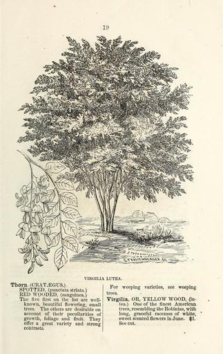 | Keywords: Ellwanger and Barry's descriptive catalogue of ornamental trees and shrubs, roses, flowering plants, etc., etc., etc (16437484765).jpg 19 <br> VIKGILIA LUTEA <br> Thorn CRATAEGUS <br> SPOTTED punctata striata <br> RED WOODED sanguinea <br> The five first on the list are well- <br> known beautiful flowering small <br> trees The others are desirable on <br> account of their peculiarities of <br> growth foliage and fruit They <br> offer a great variety and strong <br> contrasts <br> For weeping varieties see weeping <br> trees <br> Virgilia OR YELLOW WOOD ln- <br> tea One of the finest American <br> trees resembling the Robinias with <br> long graceful racemes of white <br> sweet scented flowers in June 1 <br> See cut 42747606 136502 68419 Page 19 Text http //www biodiversitylibrary org/page/42747606 1868 10 1080/00222930308678875 Ellwanger Barry ; Henry G Gilbert Nursery and Seed Trade Catalog Collection ; Mount Hope Nurseries NameFound Crataegus NameConfirmed Crataegus EOLID 29927 NameBankID 2649819 NameFound Virgilia NameConfirmed Virgilia EOLID 28022 NameBankID 1814896 Biodiversity Heritage Library Ellwanger Barry's descriptive catalogue of ornamental trees and shrubs roses flowering plants etc etc etc Garden Stories Catalogs Ellwanger Barry Nurseries Horticulture Nursery stock Ornamental trees Plants Shrubs U S Department of Agriculture National Agricultural Library bhl page 42747606 dc identifier http //biodiversitylibrary org/page/42747606 Virgilia lutea bhlGardenStories BHLinbloom ellwanger barry nurseries horticulture u s department of agriculture national agricultural library bhlgardenstories bhlinbloom Information field Flickr posted date ISOdate 2015-02-03 CC-BY-2 0 BioDivLibrary https //flickr com/photos/61021753 N02/16437484765 2015-08-25 01 53 48 cc-by-2 0 PD-old-70-1923 Ellwanger Barry's descriptive catalogue of ornamental trees and shrubs roses flowering plants etc etc etc Photos uploaded from Flickr by Fæ using a script |
