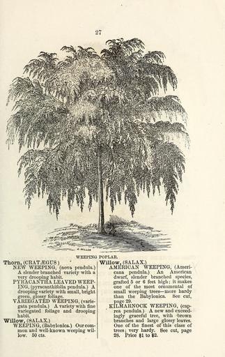| Keywords: Ellwanger and Barry's descriptive catalogue of ornamental trees and shrubs, roses, flowering plants, etc., etc., etc (16437502525).jpg WEEPING <br> Thorn CRATAEGUS <br> NEW WEEPING nova pendula <br> A slender branched variety with a <br> very drooping habit <br> PYRACAN THA LEAVED WEEP- <br> ING pyracanthifolia pendula A <br> drooping variety with small bright <br> green glossy foliage <br> VARIEGATED WEEPING varie- <br> gata pendula A variety with fine <br> variegated foliage and drooping <br> habit <br> Willow SALAX <br> WEEPING Babylonica Our com- <br> mon and well-known weeping wil- <br> low 50 cts <br> POPLAK <br> Willow SAL AX <br> AMERICAN WEEPING Ameri- <br> cana pendula An American <br> dwarf slender branched species <br> grafted 5 or 6 feet high ; it makes <br> one of the most ornamental of <br> small weeping trees ” more hardy <br> than the Babylonica See cut <br> page 29 <br> KILMARNOCK WEEPING cap- <br> rea pendula A new and exceed- <br> ingly graceful tree with brown <br> branches and large glossy leaves <br> One of the finest of this class of <br> trees; very hardy See cut page <br> 28 Price 1 to 2 42747614 136502 68419 Page 27 Text http //www biodiversitylibrary org/page/42747614 1868 10 1080/00222930308678875 Ellwanger Barry ; Henry G Gilbert Nursery and Seed Trade Catalog Collection ; Mount Hope Nurseries NameFound Crataegus NameConfirmed Crataegus EOLID 29927 NameBankID 2649819 NameFound Salax NameConfirmed Salax EOLID 8932624 NameBankID 4335049 Biodiversity Heritage Library Ellwanger Barry's descriptive catalogue of ornamental trees and shrubs roses flowering plants etc etc etc Garden Stories Catalogs Ellwanger Barry Nurseries Horticulture Nursery stock Ornamental trees Plants Shrubs U S Department of Agriculture National Agricultural Library bhl page 42747614 dc identifier http //biodiversitylibrary org/page/42747614 bhlGardenStories Weeping poplar BHLinbloom ellwanger barry nurseries horticulture u s department of agriculture national agricultural library bhlgardenstories bhlinbloom Information field Flickr posted date ISOdate 2015-02-03 CC-BY-2 0 BioDivLibrary https //flickr com/photos/61021753 N02/16437502525 2015-08-25 01 55 42 cc-by-2 0 PD-old-70-1923 Ellwanger Barry's descriptive catalogue of ornamental trees and shrubs roses flowering plants etc etc etc Photos uploaded from Flickr by Fæ using a script |
