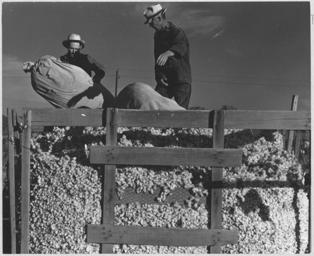 | Keywords: Eloy District, Pinal County, Arizona. Migratory cotton pickers dump their sacks into the field wagon . . . - NARA - 522250.jpg Scope and content Full caption reads as follows Eloy District Pinal County Arizona Migratory cotton pickers dump their sacks into the field wagon Wages - 75 per hundred pounds Late afternoon General notes 522250 Local identifier 83-G-44081 Department of Agriculture Bureau of Agricultural Economics Division of Economic Information ca 1922 - ca 1953 NARA-Author Lange Dorothea 1895-1965 Photographer 1372774 <br /> Still Picture Records Section Special Media Archives Services Division NWCS-S National Archives at College Park 8601 Adelphi Road College Park MD 20740-6001 11/1940 Record group Record Group 83 Records of the Bureau of Agricultural Economics 1876 - 1959 Record group ARC 412 Photographic Prints Documenting Programs and Activities of the Bureau of Agricultural Economics and Predecessor Agencies compiled ca 1922 - ca 1947 documenting the period ca 1911 - ca 1947 Series ARC 521048 File unit File unit ARC Variant control numbers NAIL Control Number NWDNS-83-G-44081 Other versions <gallery> File Eloy_District _Pinal_County _Arizona _Migratory_cotton_pickers_dump_their_sacks_into_the_field_wagon_ _ _ _-_NARA_-_522250 tif tif File Eloy_District _Pinal_County _Arizona _Migratory_cotton_pickers_dump_their_sacks_into_the_field_wagon_ _ _ _-_NARA_-_522250 jpg jpg </gallery> NARA-cooperation PD-USGov Dorothea Lange Eloy Arizona 1940 in Arizona November 1940 in the United States Cotton sacks Wagons in the United States Agricultural transport Agricultural workers Men at work in the United States Wages in the United States Men with hats |
