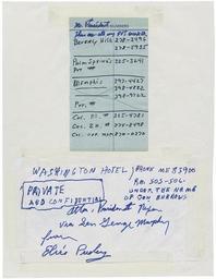 | Keywords: Elvis Letter R-018 - Page 6 of 6.jpg en On the morning of December 21 1970 Elvis Presley personally delivered a letter to the northwest gate of the White House Written on American Airlines stationery the five-page letter requested a meeting with President Nixon Presley intended to present the President with a gift of a World War II-era pistol and obtain for himself the credentials of a federal agent in the war on drugs http //www archives gov/exhibits/nixon-met-elvis/main php page doc docpage 1 1 6 Elvis Presley 1970-12-21 PD-USGov Elvis Presley Signature png Document R-018; White House Central Files Subject Files EX HE 5-1 <GALLERY> File Page one of Elvis Presley's letter to President Nixon jpg File Elvis_Letter_R-014_-_Page_2_of_6 jpg File Elvis Letter R-015 - Page 3 of 6 jpg File Elvis Letter R-016 - Page 4 of 6 jpg File Elvis Letter R-017 - Page 5 of 6 jpg File Elvis Letter R-018 - Page 6 of 6 jpg </GALLERY> Elvis Presley Elvis Presley and Richard Nixon at the White House 1970 War on Drugs in the United States |