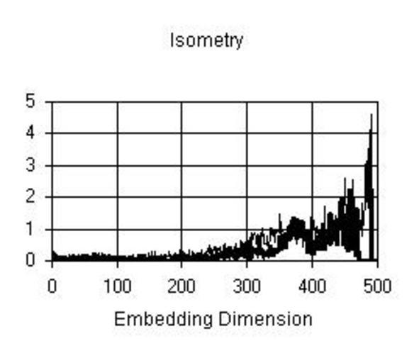 | Keywords: Embedding plot for g=4.62 r=0.01.JPG Embedding plot with embedding dimensions 1 497 of the series generated with the process equation with gain 4 62 initial condition of 0 4 and 500 data points Radius used for calculating isometries is 0 01 5000 random comparisons were done for each embedding dimension for series and its shuffled copy 2006-02-06 own assumed Lakinekaki~commonswiki Logistics | ||||