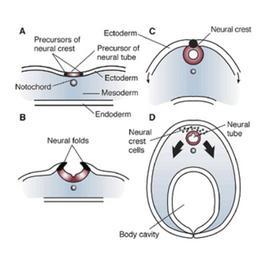| Keywords: Embryonic Development CNS.png en Formation of the neural tube cross view Early in an embryo ™s development a strip of specialized cells called the notochord A induces the cells of the ectoderm directly above it to become the primitive nervous system i e neuroepithelium The neuroepithelium then wrinkles and folds over B As the tips of the folds fuse together a hollow tube i e the neural tube forms C ”the precursor of the brain and spinal cord Meanwhile the ectoderm and endoderm continue to curve around and fuse beneath the embryo to create the body cavity completing the transformation of the embryo from a flattened disk to a three “dimensional body Cells originating from the fused tips of the neuroectoderm i e neural crest cells migrate to various locations throughout the embryo where they will initiate the development of diverse body structures D Researchers investigating fetal alcohol syndrome have extensively studied neural crest cells because they are particularly sensitive to alcohol “induced injury and cell death 2012-04-04 http //www niaaa nih gov/Resources/GraphicsGallery/FetalAlcoholSyndrome/Pages/Embryonic aspx Source Goodlett C R and Horn K H Mechanisms of alcohol “induced damage to the developing nervous system Alcohol Research Health 25 3 175 “184 2001 PD-USGov Uploaded with UploadWizard Embryology Neural crest Original upload log wikitable - - 2012-04-04 18 33 04 350 × 325 23577 bytes Bobjgalindo <nowiki></nowiki> |