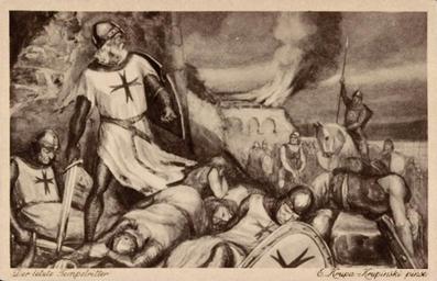 | Keywords: Emil Krupa-Krupinski - Der letzte Tempelritter.jpg de Der letzte Tempelritter <br />Die Templer von Lahneck Nach dem Gemälde von E Krupa-Krupinski Trotzdem der Papst den Orden der Tempelritter aufgelöst hatte blieben die Ritter beisammen und zogen sich auf Burg Lahneck an Rhein zurück Dort belagert fielen sie kämpfend bis zum letzten Mann Ruland Rheinisches Sagenbuch http //www akpool co uk/postcards/24231722-kuenstler-ak-krupa-krupinski-e-der-letzte-tempelritter-schlacht Emil Krupa-Krupinski 1872-1924 1899 Emil Krupa-Krupinski PD-Art |