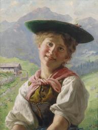 | Keywords: Emil Rau Dirndlkopf.jpg Ein Dirndl vor Berglandschaft rückseitig bezeichnet Dirndlkopf signiert E Rau Öl auf Leinwand 45 5 x 36 5 cm http //www dorotheum com Dorotheum by 1937 Emil Rau 1858-1937 PD-old-70 Images from Dorotheum Emil Rau Tracht in art Dirndl |