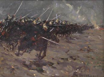 | Keywords: Emilian Lazarescu - Sarja de cavalerie.jpg Artwork Creator Emilian Lăzărescu The cavalry charge La carga de caballería La charge de cavalerie The cavalry charge depicting World War I events Şarja de cavalerie < 1935 oil on canvas cm 24 5 33 private collection accession number object history http //www tudor-art com/main php category vand language 0 id 1924 disciplina 1 ses da Sold in auction 2009-02-15 credit line Signed lower right in black Semnat dreapta jos cu negru http //alis ro/rezultat/rpictura htm PD-old-auto 1934 Emilian Lăzărescu World War I in Romanian art World War I forces of France Warhorses Cavalry of Romania Cavalry in paintings Cavalry charges Oil on canvas paintings in Romania |