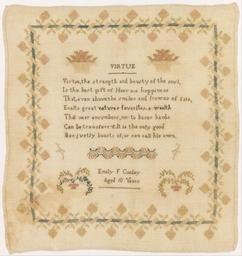 | Keywords: Emily F. Cooley - Sampler - Google Art Project.jpg ~ 1830 Emily 6854094 F Cooley /collection/cooper-hewitt-national-design-museum/artwork/sampler-emily-f-cooley/6835393/ 177049 Emily F Cooley /artist/emily-f-cooley/12692379/ 12692379 /collection/cooper-hewitt-national-design-museum/ Cooper-Hewitt National Design Museum 3644669 http //www cooperhewitt org/ /collection/cooper-hewitt-national-design-museum/artwork/sampler-emily-f-cooley/6835393/ 1820 ca 1830 Medium silk embroidery on linen foundationTechnique embroidered in cross stitch compound and looping on plain weave foundation By 1981 Gertrude M Oppenheimer1981 Cooper-Hewitt Museum 430 6835393 False 1840 1981-28-434 http //collection cooperhewitt org/view/objects/asitem/id/177049 Bequest of Gertrude M Oppenheimer Sampler 1820 1850 w420 x h430 cm ca 1830 False 0 943359375 Object sampler-emily-f-cooley Sampler s 420 H x W 43 2 x 41 9 cm 17 x 16 1/2 in Emily F CooleyAged 10 Years Medium silk embroidery on linen foundationTechnique embroidered in cross stitch compound and looping on plain weave foundation By 1981 Gertrude M Oppenheimer1981 Cooper-Hewitt Museum special url_id mAGQfCBP9-_eCA PD-old-70-1923 Google Art Project works by Emily F Cooley Textiles in the Cooper “Hewitt Smithsonian Design Museum 1830s samplers Google Art Project works in Cooper-Hewitt Smithsonian Design Museum 1830 works |