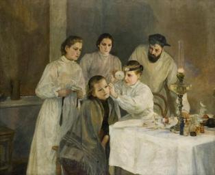 | Keywords: Emily Shanks Scene in a Russian Hospital The Ear Inspection.jpg Artwork Creator Emily Shanks s 1890 oil canvas cm 88 8 106 6 langswitch Chelmsford Museum and the Essex Regiment Museum Essex UK Челмсфо дский музей Эссекс Великоб итания object history exhibition history credit line accession number http //www bbc co uk/arts/yourpaintings/artists/emily-shanks Emily Shanks Realist genre paintings Hospitals in Russia Otology in art Medical treatment in art PD-old-70 | ||||