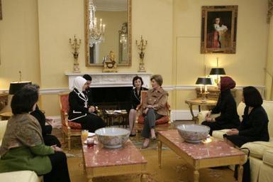 | Keywords: Emine Erdoğan and Laura Bush.jpg en Mrs Laura Bush hosts a tea for Mrs Emine Erdogan wife of Prime Minister Recep Tayyip Erdogan of Turkey in the Yellow Oval Room within the private residence of the White House tr First Lady Laura Bush Başbakan Recep Tayyip Erdoğan'ın eşi Emine Erdoğanı Beyaz Sarayda yer alan Sarı Oval Ofiste ağırlıyor 2007-11-05 12 40 23 http //georgewbush-whitehouse archives gov/news/releases/2007/11/images/20071105-1_p110507sc-0528-515h html The White House White House photo by Shealah Craighead PD-USGov-POTUS PD-USGov Uploaded with UploadWizard Emine Erdoğan Laura Bush in 2007 Yellow Oval Room |