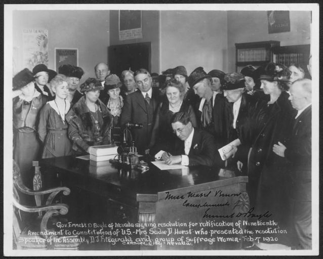 | Keywords: Emmett D. Boyle of Nevada 160070v.jpg Governor Emmett D Boyle of Nevada signing resolution for ratification of Nineteenth Amendment to Constitution of U S - Mrs Sadie D Hurst who presented the resolution Speaker of the Assembly D J Fitzgerald and group of Suffrage Women Feb 7 1920 Carson City Nevada 1920 Feb 7 Photograph of group of suffragists watching the governor of Nevada sign resolution for ratification in his office 1 photograph print 8 x 10 in accession number Call Number Location National Woman's Party Records Group I Container I 160 Folder Ratification Campaign 1919-20 Source Collection Records of the National Woman's Party institution Library of Congress LOC-image mnwp 160070 PD-old suffragettes Suffragettes wearing fur Beaver clothing Fur fashion in 1920 1920 in Nevada Carson City Nevada |