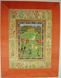 | Keywords: Emperor Azam Shah.jpg en Emperor Azam Shah garbed in white is carried in a golden palanquin His horse is saddled and ready nearby Soldiers holding large quivers of bows and arrows are lined up in the foreground Attendants hold deer and gazelles on leashes This is in preparation for shikar or hunting In the background is an army of elephants with royal flags cavalry and infantry and a city scape in the far left corner Undulating hills and a lake form the backdrop 19thC early http //www britishmuseum org/research/search_the_collection_database/search_object_details aspx objectid 178428 partid 1 searchText mughal fromADBC ad toADBC ad numpages 10 images on orig 2fresearch 2fsearch_the_collection_database aspx currentPage 48 Mughal Style PD-Art Azam Shah Uploaded with UploadWizard Paintings of Mughal emperors |