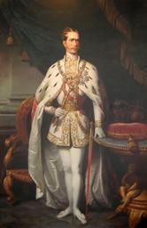 | Keywords: Emperor Franz Joseph I of Austria Sept. 2006 001.jpg Artwork Creator Image reproduction of a painting hanging at the Café Central in Vienna's first district Innere Stadt The piece was painted in 1859 according to the information plaque below 1859 Technique oil Café Central Vienna Own Gryffindor 2006-09 Image may be used for any purpose other versions PD-old-100 DEFAULTSORT 1859; Franz Joseph I 19th-century unidentified court painters Café Central Vienna Portrait paintings of Franz Joseph I of Austria 1850s paintings in Austria 1859 portrait paintings Male 19th-century oil portraits of standing men at full length in ceremonial robes 19th-century portrait paintings in Austria Collar of the Order of the Golden Fleece in portrait paintings Ermine clothing in art Franz Joseph I of Austria in 1859 Globus cruciger in portrait paintings Green drapery in portrait paintings Imperial mantles in portrait paintings Male white shoes in portrait paintings Portrait paintings of men with crowns on cushions Portrait paintings of men with swords Portrait paintings of standing men with hands resting on tables Portrait paintings with Spanish composition Portraits holding sceptres Portraits with gloves Sash of the Military Order of Maria Theresa in portrait paintings Stars of chivalric orders in portrait paintings Tassels in portrait paintings Thrones in portrait paintings |
