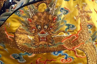 | Keywords: Emperor's 12-sign semiformal dragon robe, view 3, China, 18th century, silk, gold thread, embroidery - Royal Ontario Museum - DSC04470.JPG en Exhibit in the Royal Ontario Museum Toronto Ontario Canada This work is old enough so that it is in the public domain Photography was permitted in the museum without restriction 2013-10-08 16 23 36 own Daderot cc-zero Patricia Harris Gallery of Textiles Costume at the Royal Ontario Museum Uploaded with UploadWizard Clothing of the Qing Dynasty Cloud bands Imperial clothing of China |