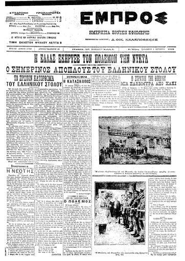 | Keywords: Empros1912.jpg Greek cover of the Greek newspaper Empros annaouncing the beggining of the First Balkan War of 1912 Η εφημερίδα Εμ ρός ανακοινώνει την κηρύξει του Α΄Bαλκανικού ολέμου http //www nlg gr/digitalnewspapers/ns/main html 1912 author PD-Old Original upload log el wikipedia MARKELLOS CommonsHelper el wikipedia Empros1912 jpg 2008-04-03 14 02 Tony Esopi 1654×2339× 1381163 bytes <nowiki> Πληροφορίες εικόνας Περιγραφή Η εφημερίδα Εμ ρός ανακοινώνει την κηρύξει του Α΄βαλκανικού ολέμου Πηγή http //www nlg gr/digitalnewspapers/ns/main html Ψηφ�</nowiki> 1912 newspapers Newspapers of Greece Category First Balkan War |
